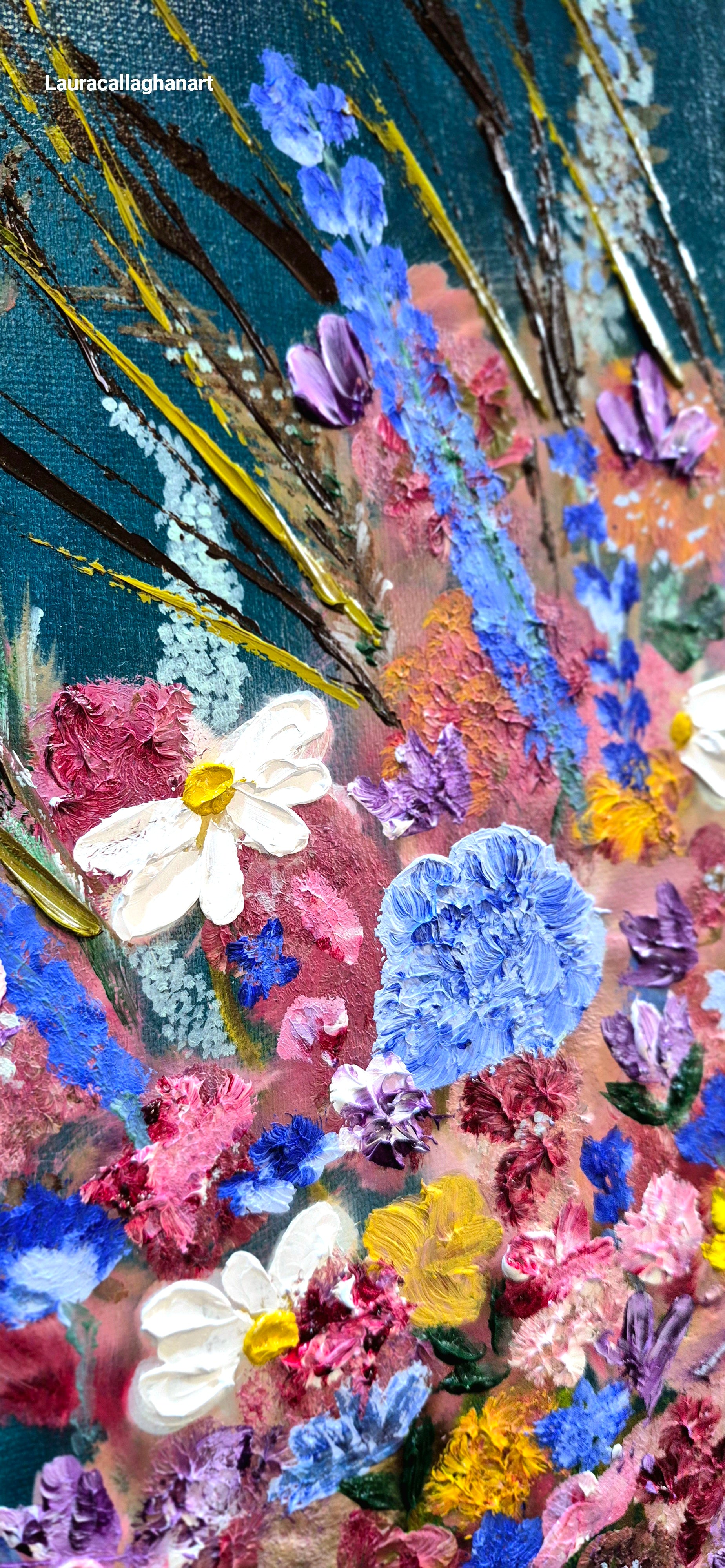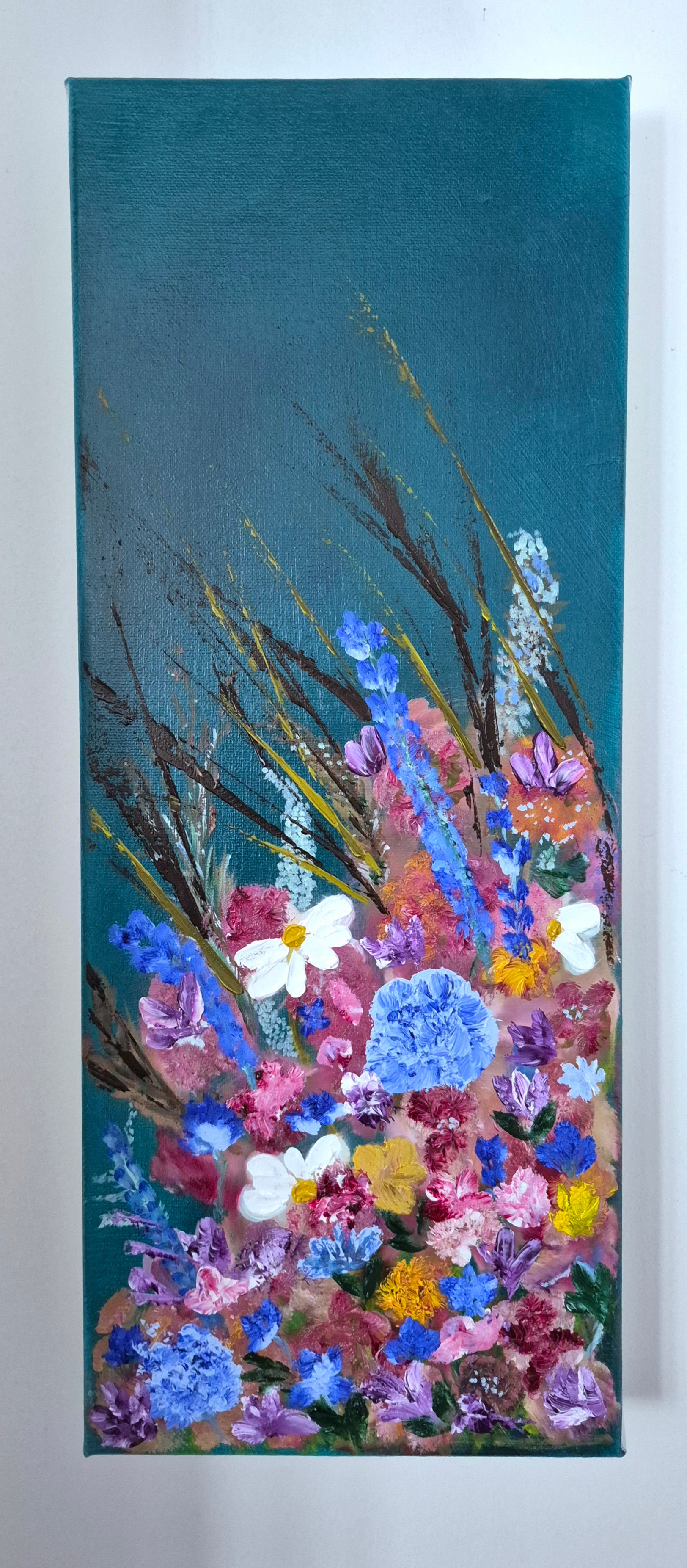 Available for purchase October, delightful blue teal and turquoise background, popping with colour, you find yourself transported into a fragrant and enchanted garden.