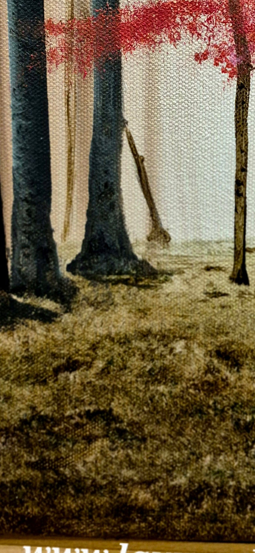 Below, the forest floor is a richly textured tapestry of mottled greens. This painterly floor a mix of mosses, decaying leaves, and damp earth—provides a beautiful complexity that grounds the scene. The interplay of the rough green textures against the smooth, bold red creates a dynamic tension that is both visually stimulating and emotionally resonant.