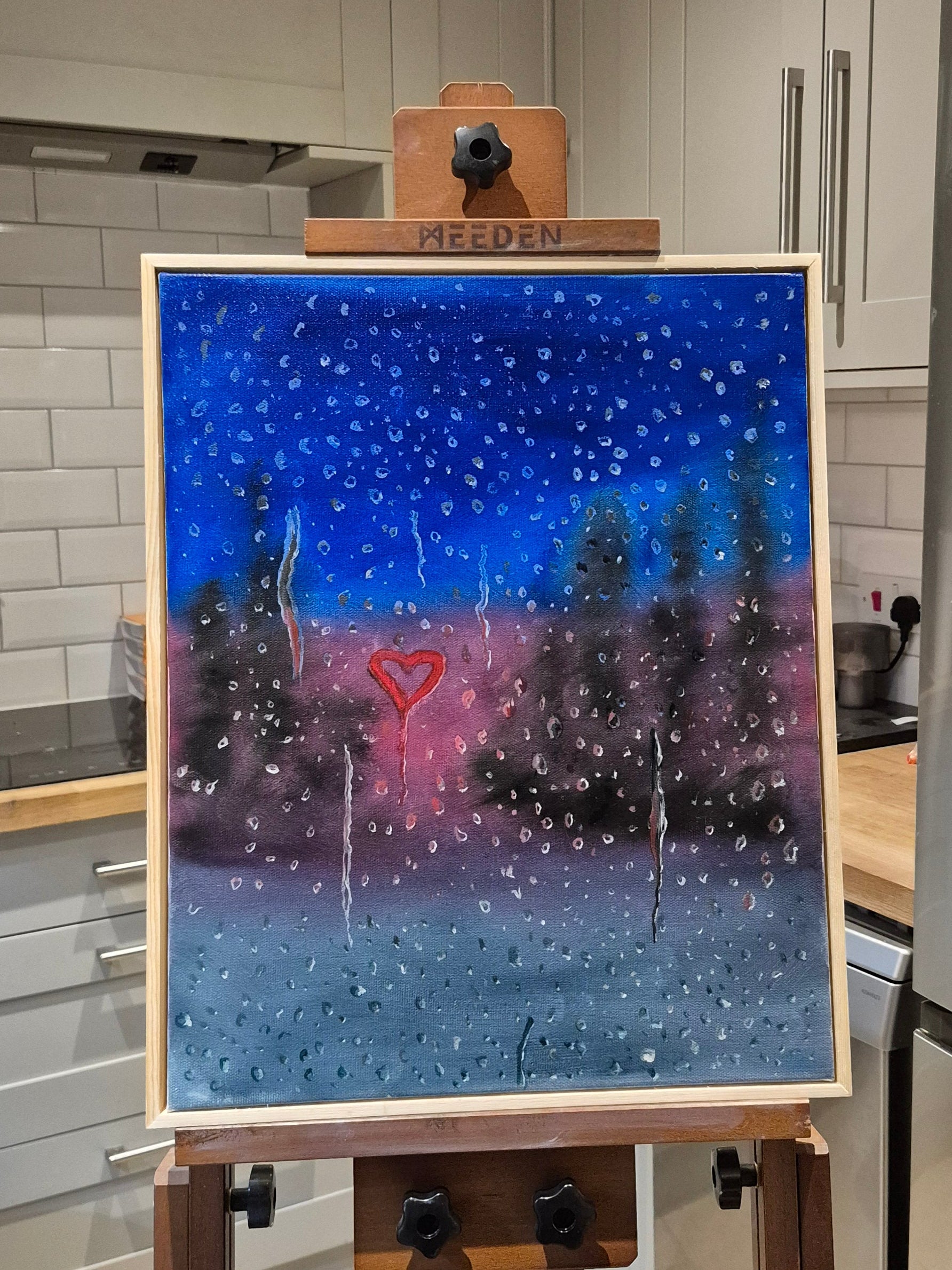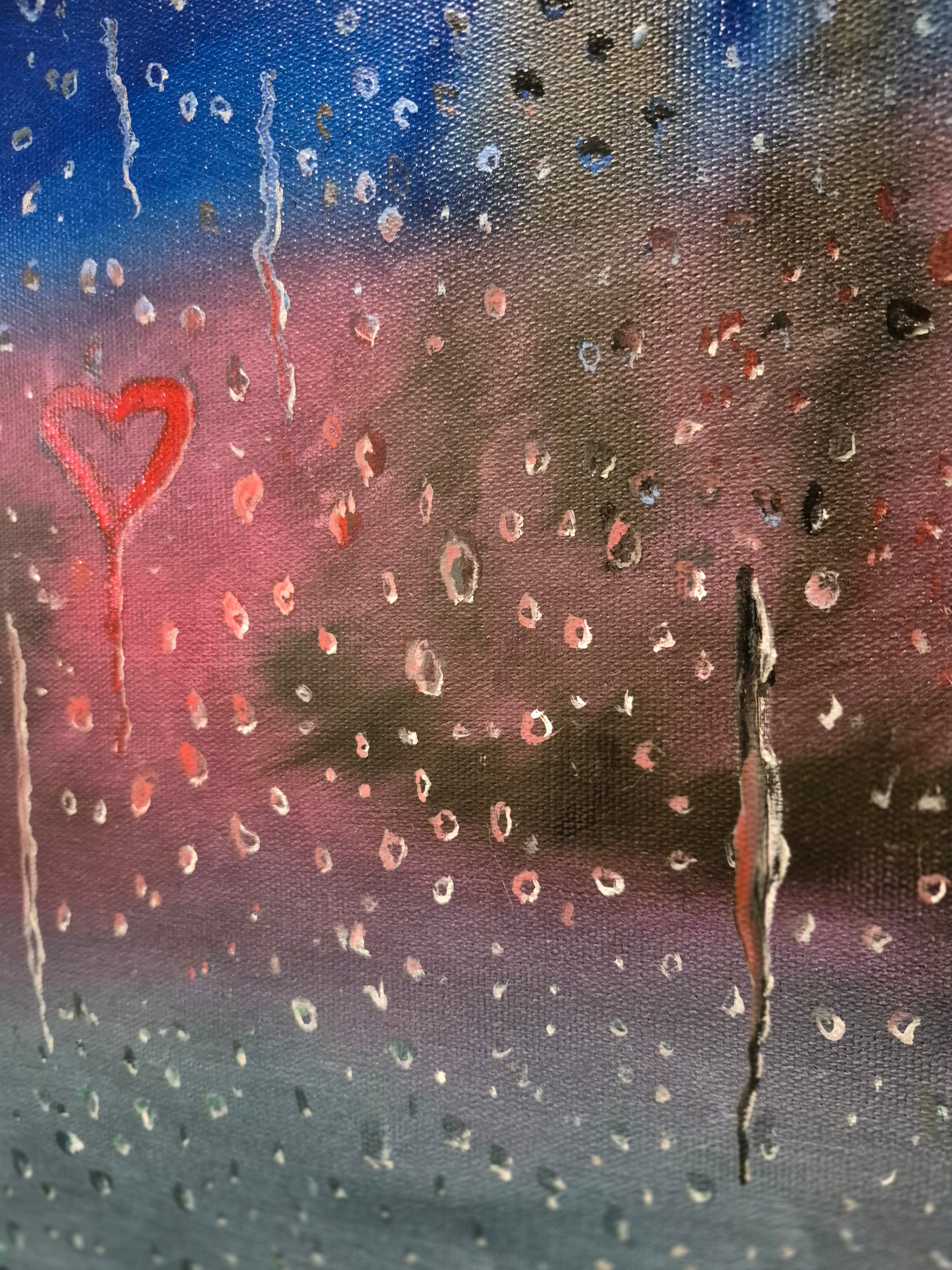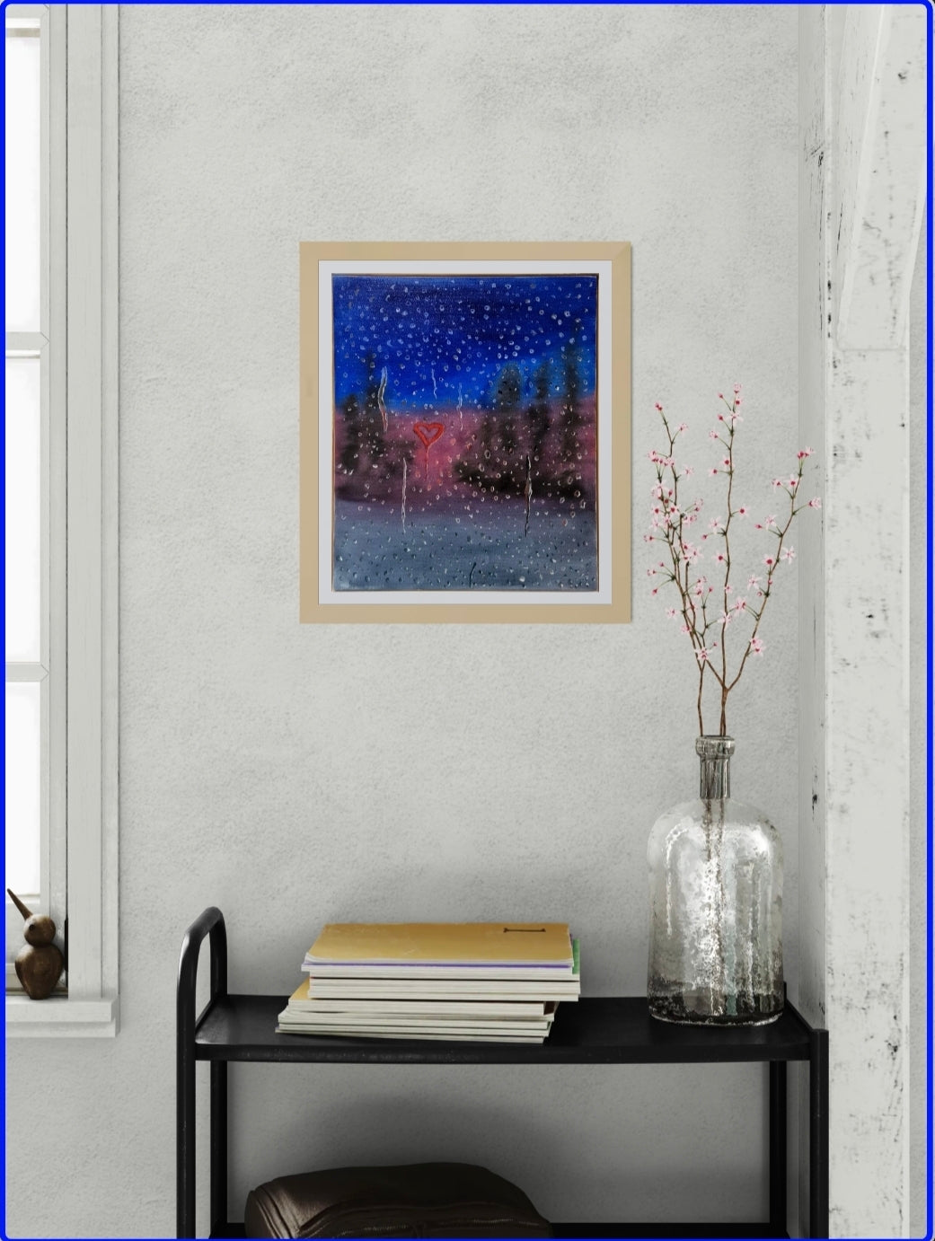 My intimate and melancholic study of distance and enduring affection. This original oil painting captures a window pane at the fleeting moment of dusk, heavily veiled by rain. The scene is dominated by a wash of the cool, muted tones, suggesting the rapidly fading light of day. Through the blurry glass, faint, abstracted silhouettes of the outside world, trees, grass, and the last hazy streaks of the setting sun are just visible, grounding you in a moment of travel or transition.
