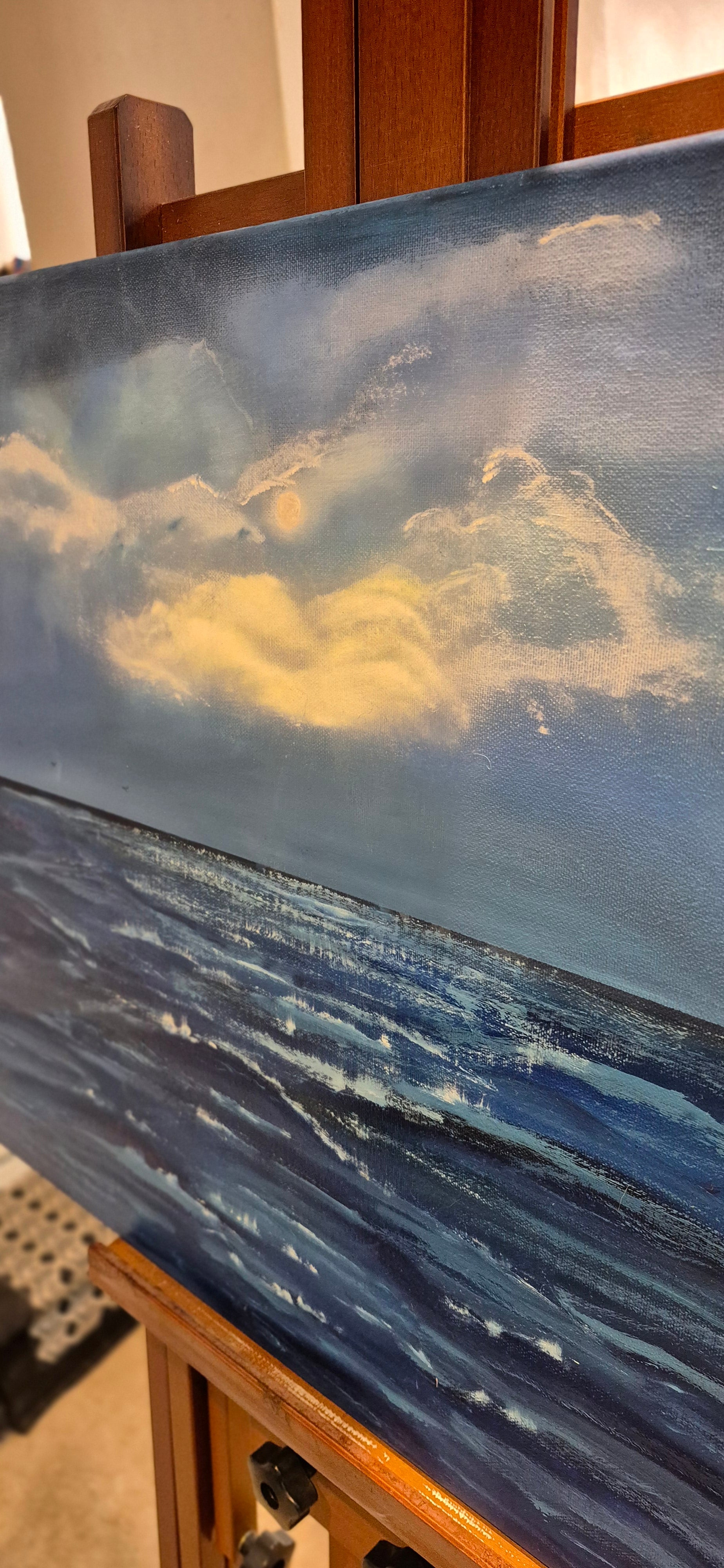 This piece echoes a calmness and timeless energy of the sea, under the face of the watchful moon, for which everything on earth is in synchronicity with, let this artwork take you to a calm and beautiful place where all your emotions can let go and you feel the peace and love that has brought about this composition.